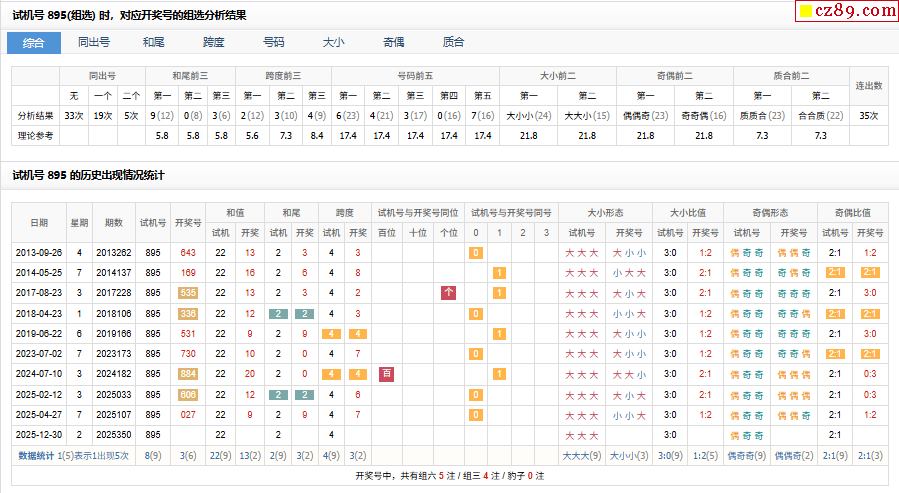 > 350期福彩3D试机号895对应开奖号的组选分析结果